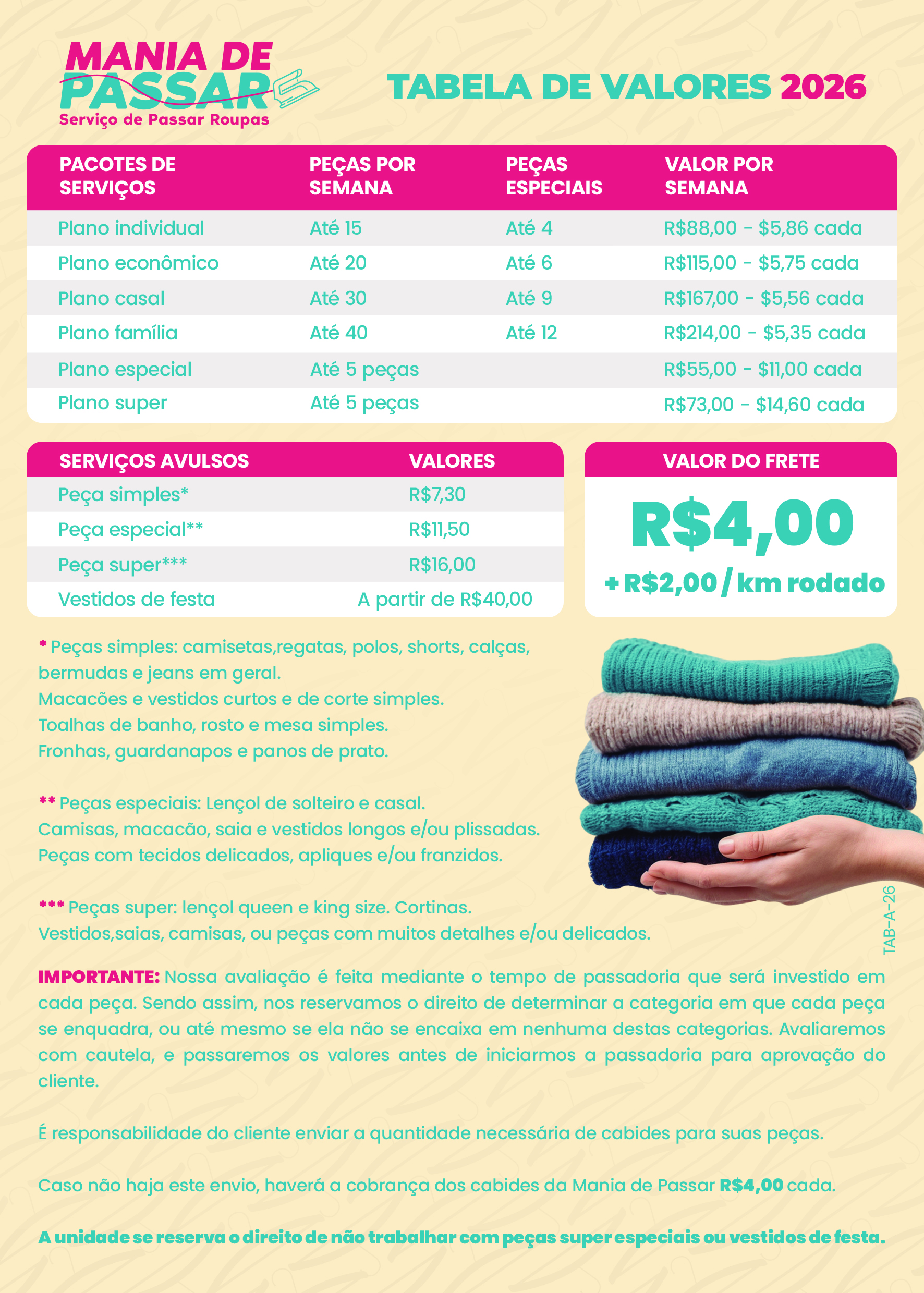 Passamos sua roupa com muito cuidado e carinho