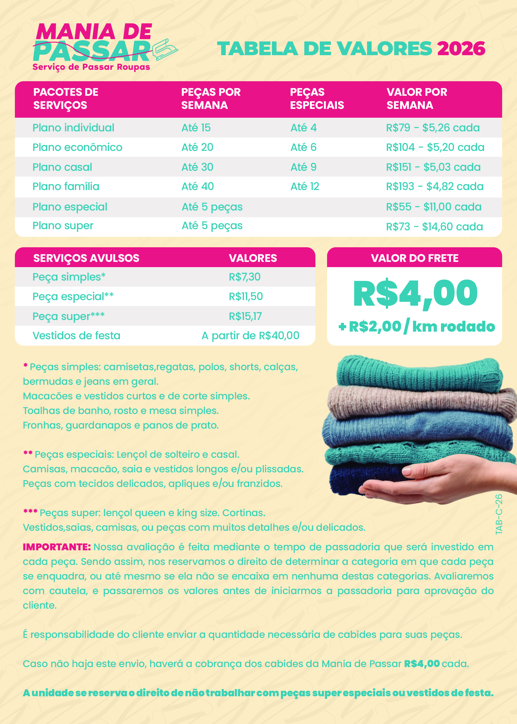 A unidade contratada presta o serviço de passar sua roupa uma vez por semana